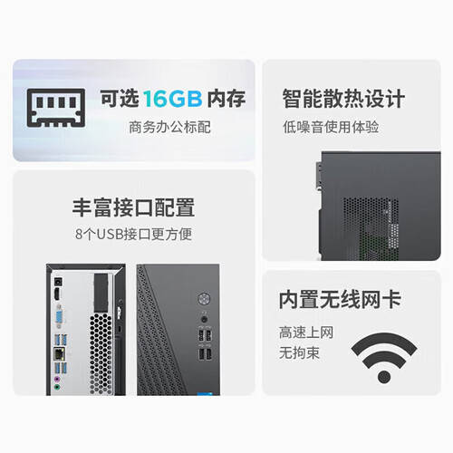 设计方面,这款台式机以简洁黑色外观为主调,时尚而不失大气,完美融入任何办公或家庭环境。小巧的机身设计也为您的桌面节省了宝贵的空间,避免了笨重设备带来的视觉负担。