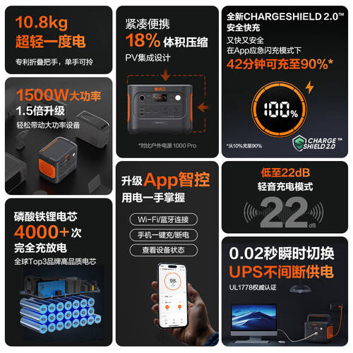 - 大容量1070Wh:强大的1500W输出功率,确保长时间的野外活动电力供应。
