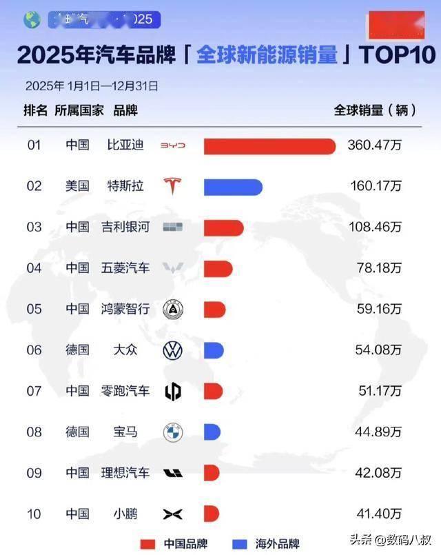 2025年全球新能源汽车销量榜单正式揭晓,中国品牌以绝对实力横扫全球市场,交出了一份震撼行业的成绩单。全年TOP10榜单中,比亚迪、吉利银河、五菱等7个中国品牌强势入围,比亚迪更是以360.47万辆的成绩登顶全球第一,销量几乎是第二名特斯拉的2.25倍,展现出“一骑绝尘”的统治力。这不仅是单一品牌的胜利,更标志着中国新能源汽车产业已从“跟跑”全面转向“领跑”。