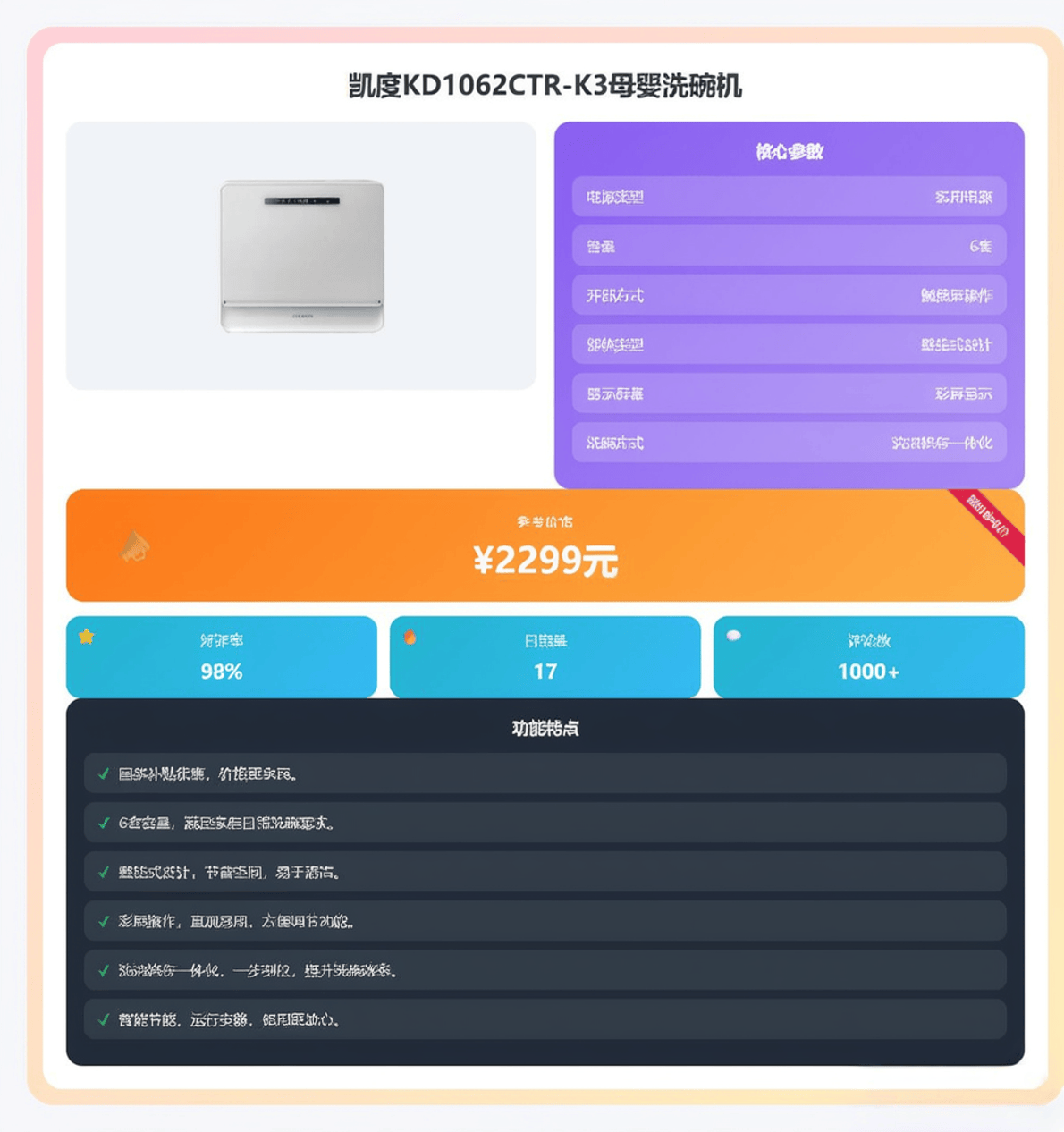 首先,我们来看看这款专为母婴家庭设计的洗碗机——凯度KD1062CTR-K3。它的核心卖点在于为有婴幼儿的家庭提供消毒级的洁净,确保餐具的卫生安全。