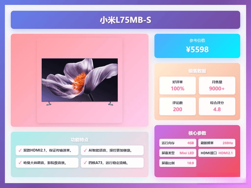 小米S75 Mini LED电视的低反屏技术让人惊喜,光线反射少,屏幕看起来更纯净。无论是在明亮的客厅还是阳光直射的角落,画面依然清晰鲜明。生活中那些烦人的反光问题,基本上都能通过这款电视解决。