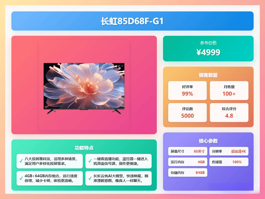 长虹85D68F-G1拥有超大85英寸的屏幕,全通道144Hz高刷新率为游戏党和追剧狂准备,画面流畅得让你忘记自己坐在沙发上。无论是HDMI还是USB,信号都能流畅切换,影像细节完美呈现。