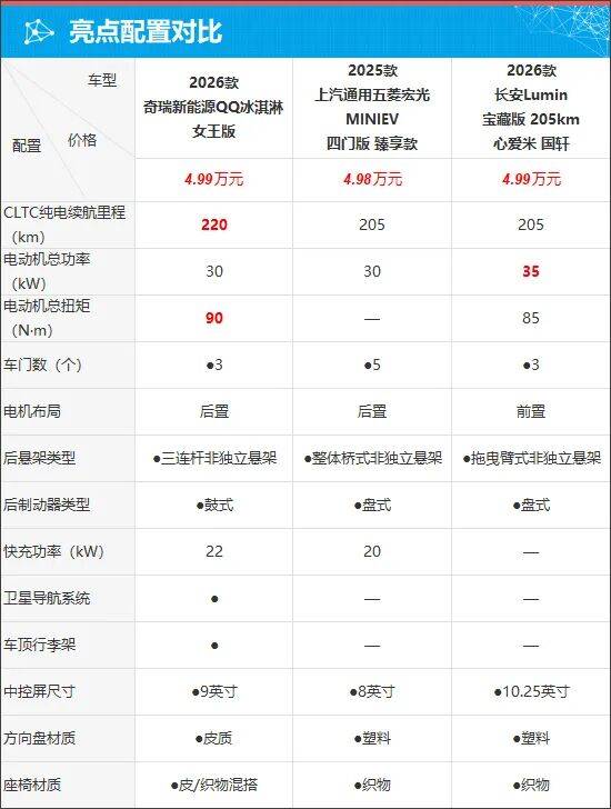具体到车辆配置层面,我们挑选了售价尽可能相近的车型。对比来看,奇瑞冰淇淋的核心亮点当属220km的CLTC纯电续航里程。虽然对比竞品车型领先幅度并不算大,但是对于入门级纯电动微型车而言,这部分提升还是能够切实缓解用户的里程焦虑,并在一定程度上减少日常充电频次。另外,无论是皮质方向盘还是皮/织物混搭的座椅材质,奇瑞冰淇淋对比竞品车型也都明显更具品质感。