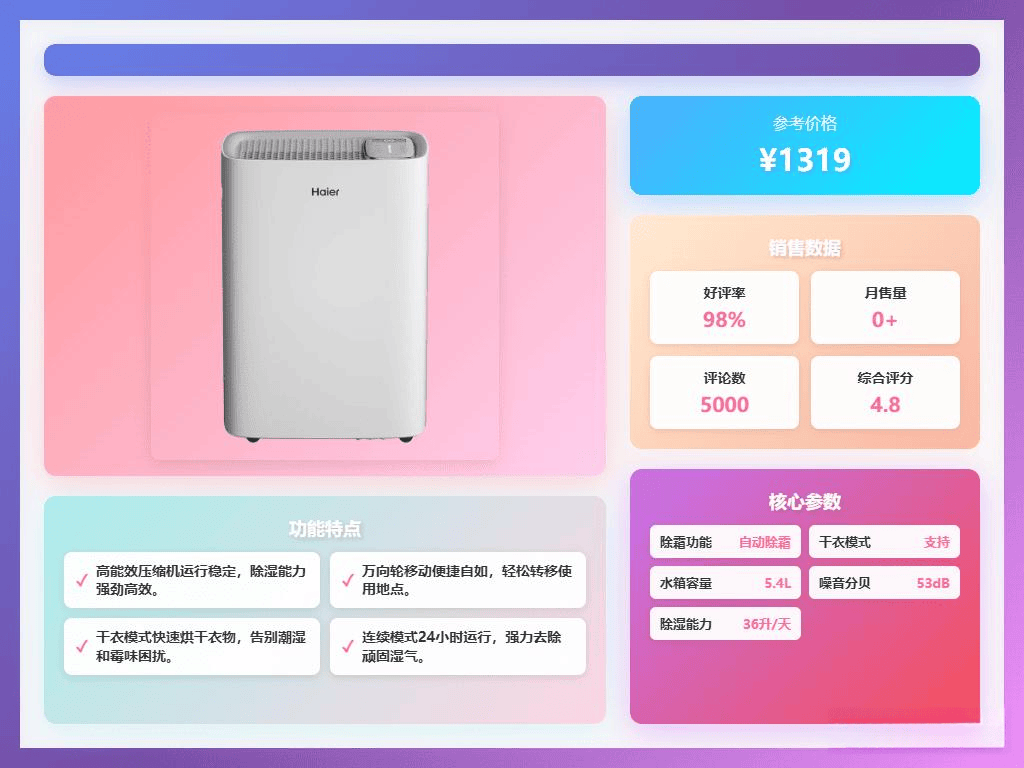 亮点:湿度监控、水满自动停机、干衣除霜多功能