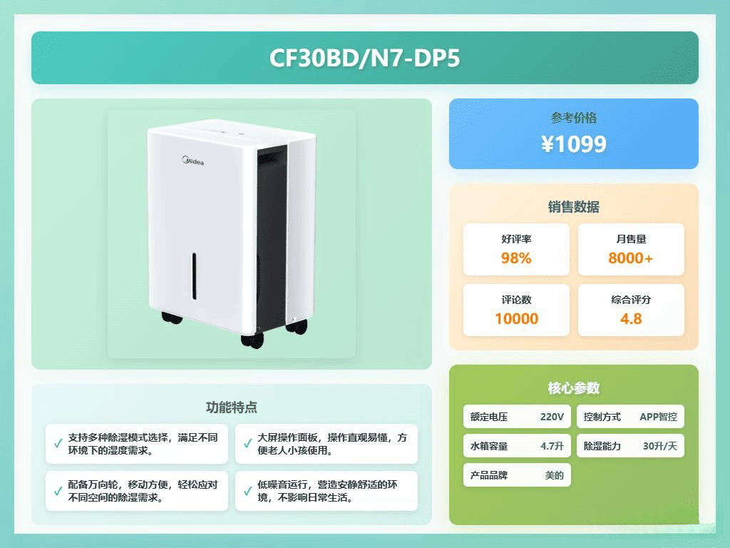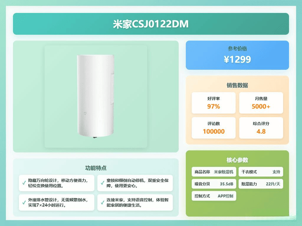 亮点:湿度监控、水满停机、万向轮设计