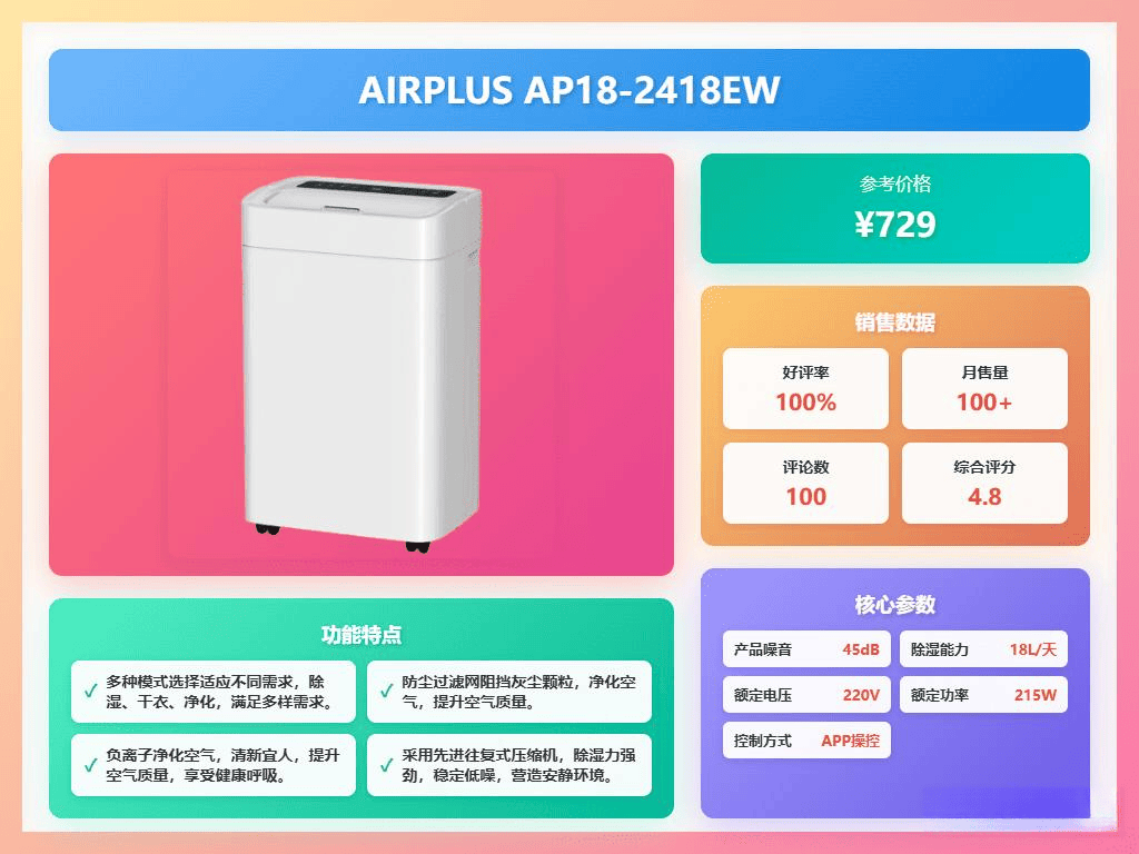 点评:AIRPLUS的除湿机操作非常方便,配备了智能湿度监控,能自动调节到理想湿度,让家里空气更干爽。它还支持APP远程操控,随时在手机上调节状态,十分贴心。