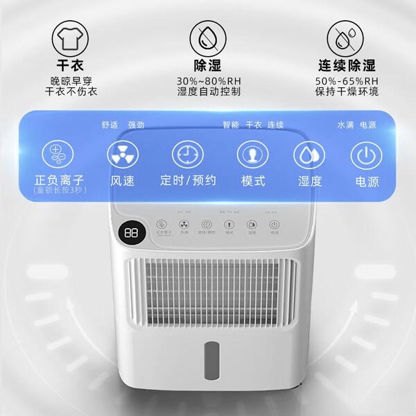 亮点:全屋除湿、快速除湿、烘干衣物、智能控湿