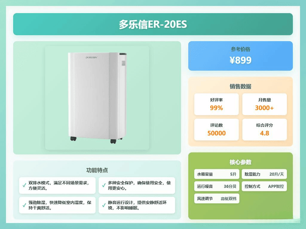 亮点:20L每日除湿、松下双转子压缩机、智能远程控制、静音设计
