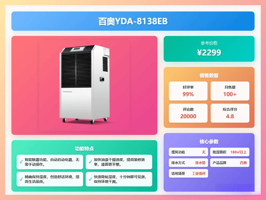 点评:百奥YDA-8138EB除湿机的湿度监控功能让你无需经常盯着湿度数值,设备会自动调节,保持空气干爽。自动除霜功能也非常实用,结霜时它会自动化霜,无需担心寒霜影响运行,能持续高效工作。