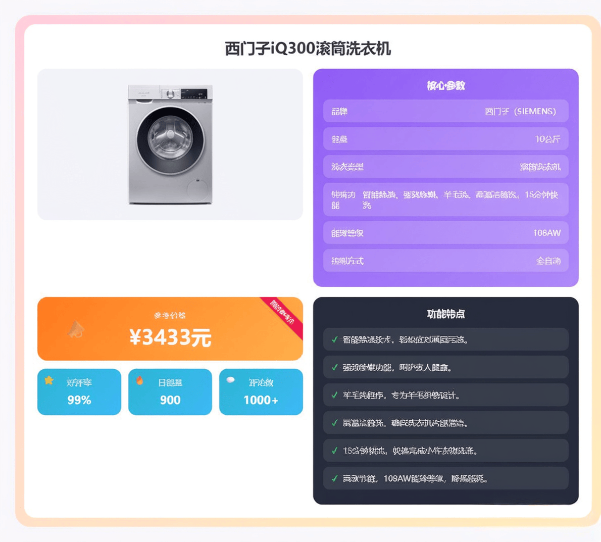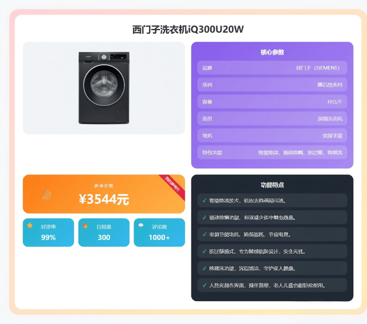 最后,我们来看看这款同样价格为三千九的iQ300U20W。它与第二款的价格一致,但属于同一价位区间的“不同版本”或“功能侧重不同”的型号。“U”系列可能在某些特定功能或设计细节上与“100”系列有所区别。