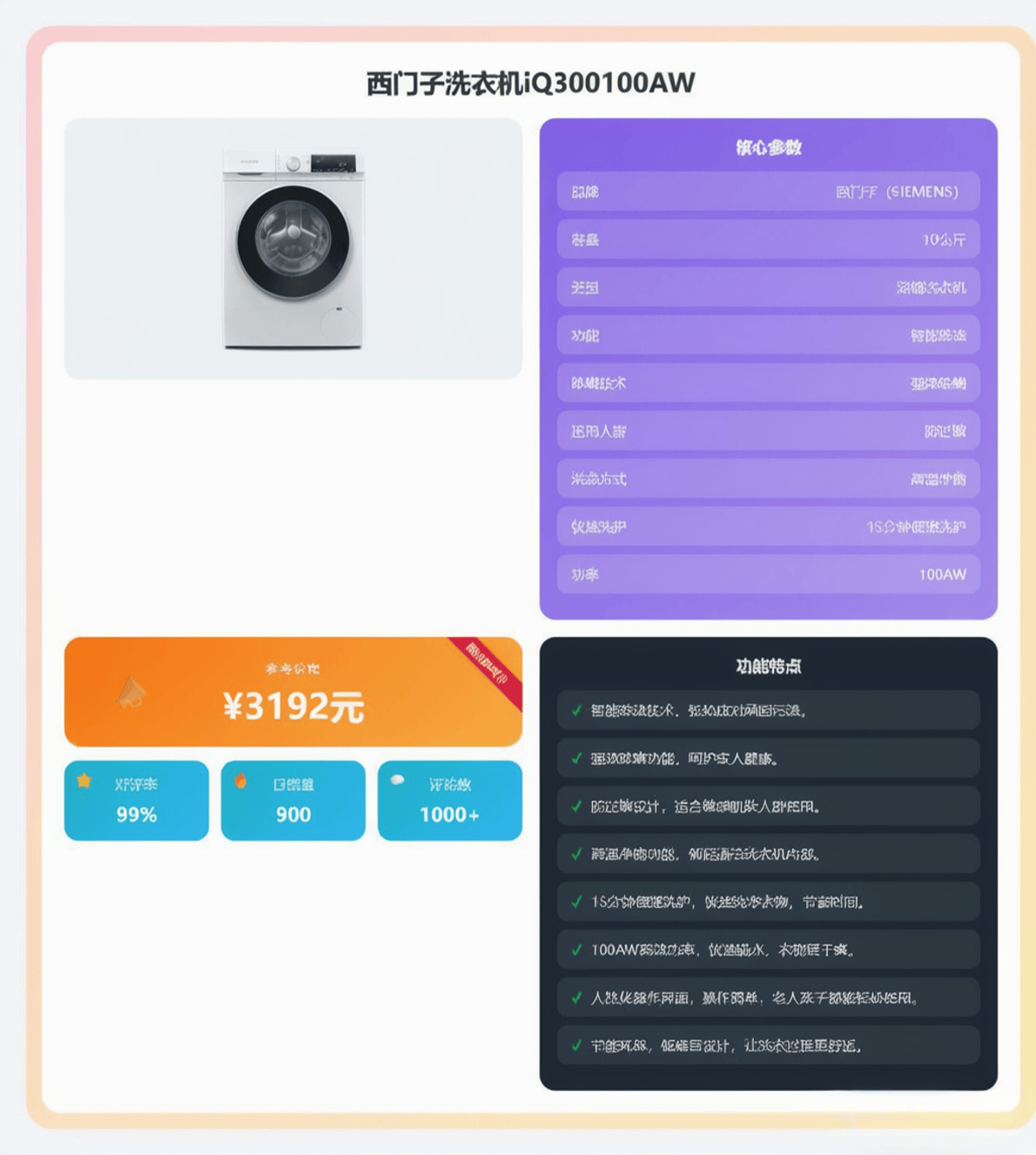 接下来,我们来看这款价格为三千九的iQ300100AW,相比基础款高出三百多元。这部分溢价主要体现在两个方面。首先是“洗涤程序的丰富性”。型号中的“100”可能代表它提供了更多样化的专业洗涤程序。