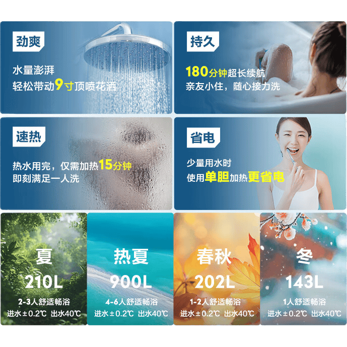 这款电热水器采用了专利金刚瞬热舱技术,能够在不同季节为您提供高效热水,满足家庭的多样需求。安全设计方面,防电墙的设置有效避免了电击风险,确保了使用的安全性。