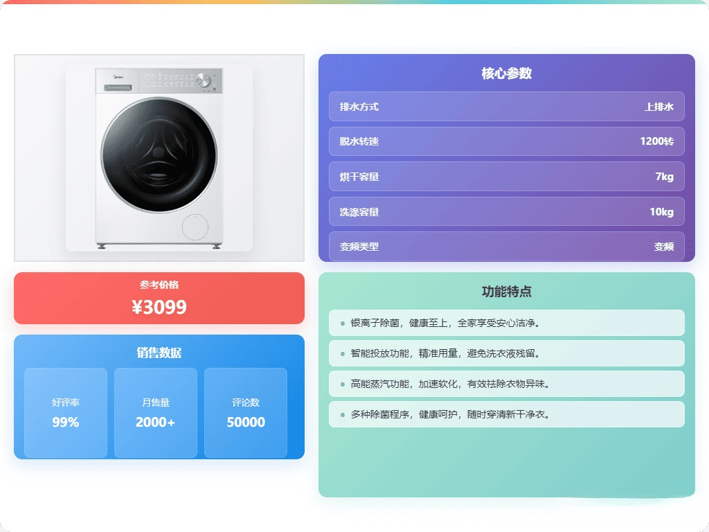 写在最后:这次给大家精选的十款美的洗衣机,都是在2500元以内,并且在容量、除菌、智能等方面表现不错的机型。希望这份选购指南能帮助你找到心仪的洗衣机,告别洗衣烦恼,轻松享受品质生活!毕竟,一台好洗衣机,能让生活幸福感up up!