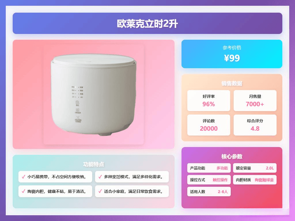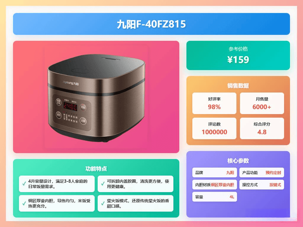 参数:容量3L、快煮8分钟、九段煮饭模式、六层黑晶内胆、支持多种烹饪方案