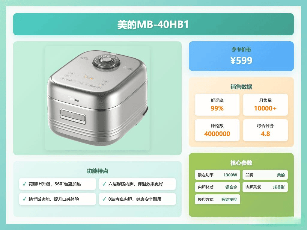 参数:4L容量、1300W功率、IH立体加热技术、智能操控、特氟龙涂层内胆