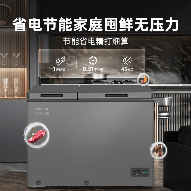 - 双温双箱:冷柜内部分为冷冻区和冷藏区,两个区域独立控温,储存不同食材更科学。