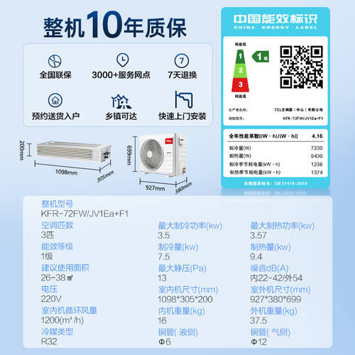 此外,TCL还为该空调提供了整机10年包修的售后服务,让您使用更安心。无论是家庭用户还是企业用户,都能在这款空调中找到理想的解决方案。