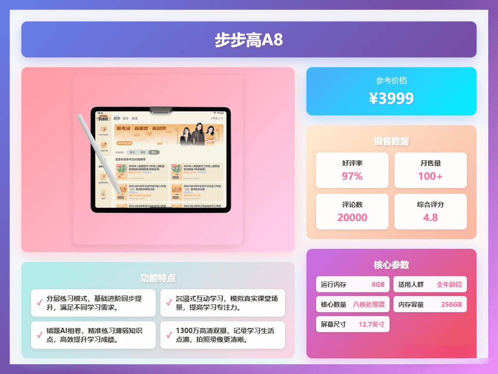 硬件配置上,搭载八核高性能处理器和8GB运行内存,确保多任务同时进行不卡顿。256GB的大存储空间可以放下大量教材和学习资料,电池容量达8000mAh,能保证长时间使用,非常适合孩子全天候学习需求。