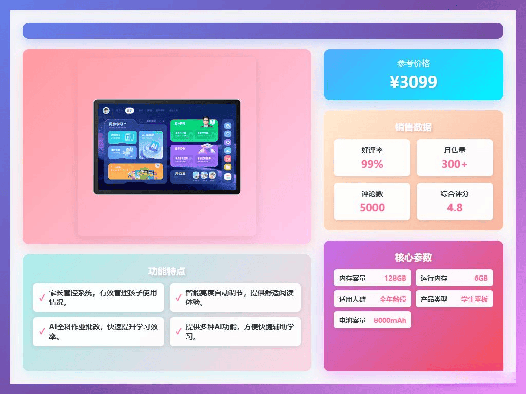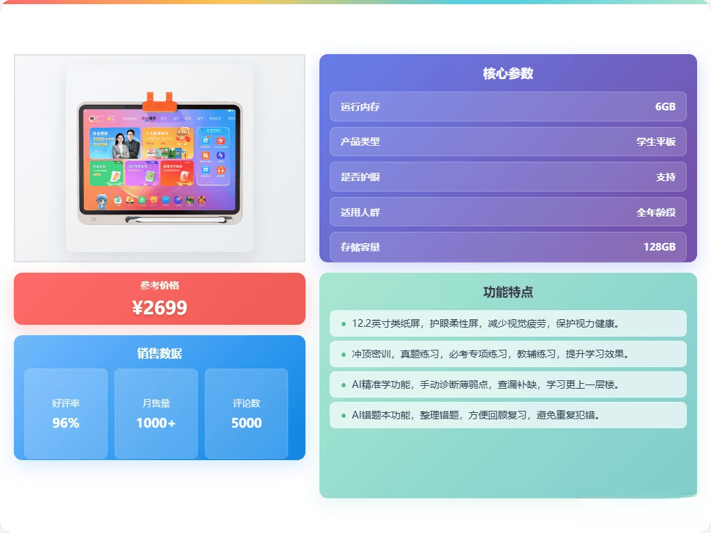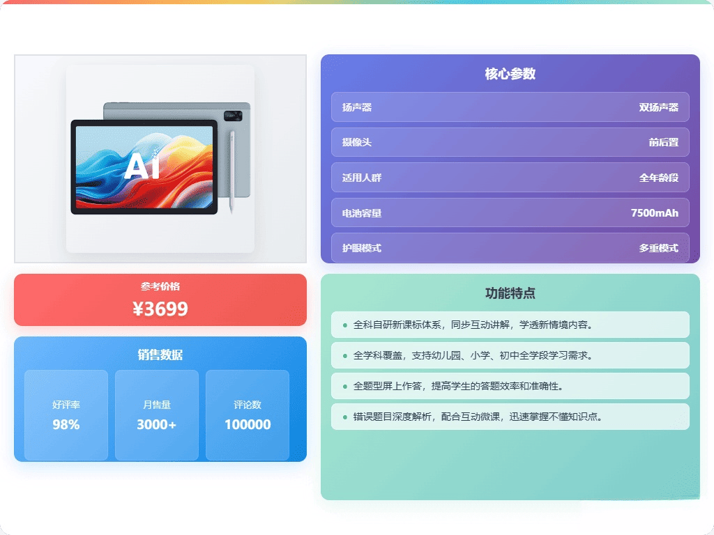 这款平板支持学练双模式,可以轻松切换同步学习和针对性练习。内置丰富的多学科课程,从小学到高中的重点知识,都能覆盖。特别是智能错题练习,通过AI组卷,只练不会的内容,还配有视频讲解,帮助孩子理解薄弱环节,提升学习效率。