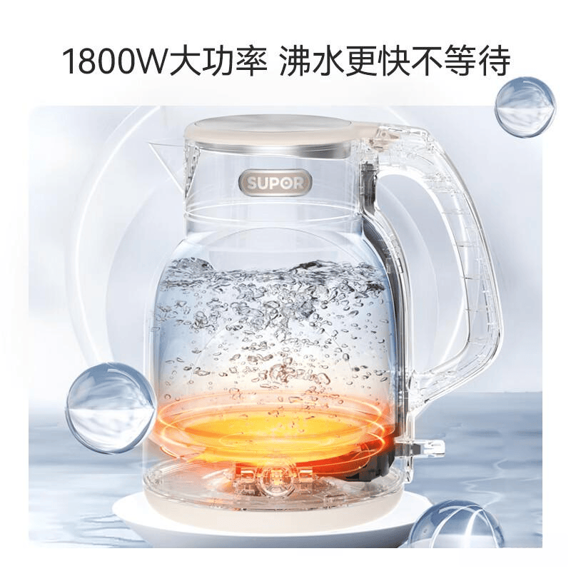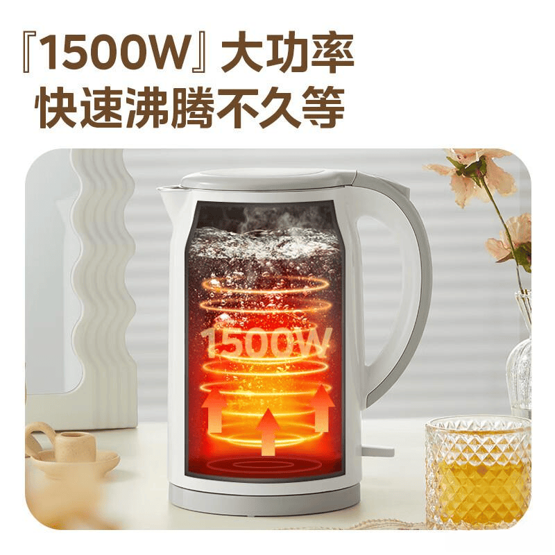 为了更高的安全性,这款水壶配备了双层防烫设计,有效隔热,使用时即使触摸壶体也不会感到烫手,减少了烫伤的风险。而1800W的高功率加热,让水快速沸腾,节省了等水烧开的时间,提升了厨房的效率。