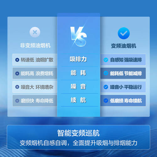 这款油烟机采用顶侧双吸结构,具有25m³/min的大吸力,特别适合高强度烹饪环境。其变频科技可以智能调节吸烟与排烟能力,确保在不同烹饪条件下都能有效排烟。