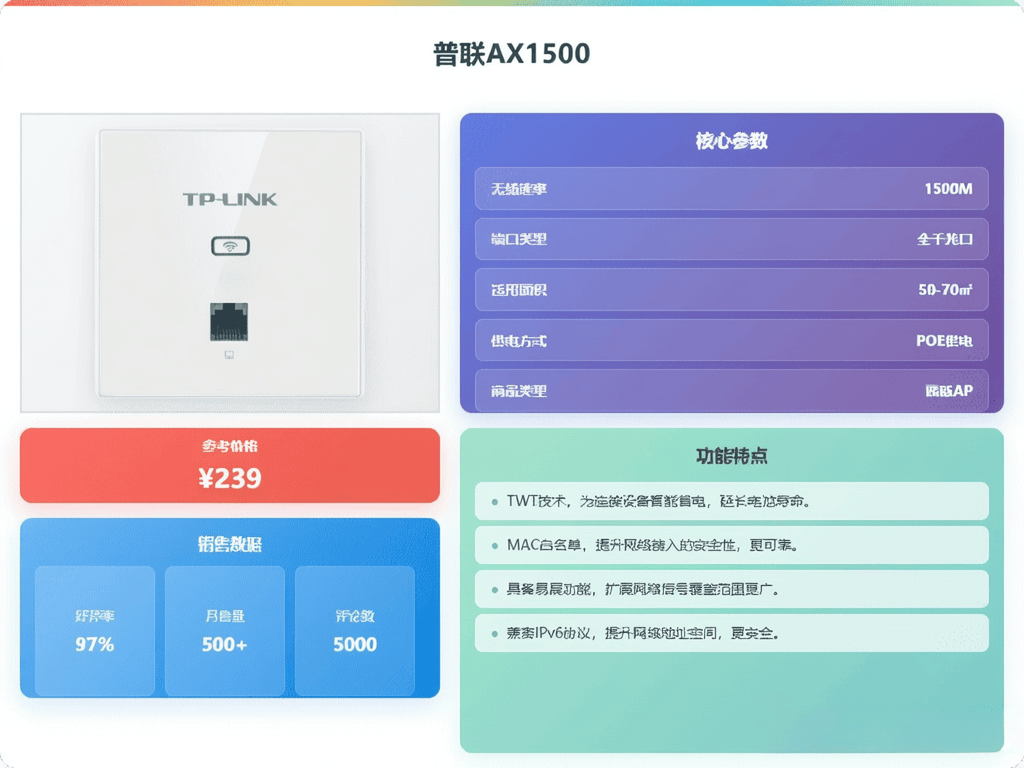 普联AX1500面板AP支持Wi-Fi 6技术,无线速率最高达1500M,连接速度快且稳定,家庭使用非常顺畅。它的国标86型面板设计,安装特别方便,墙壁插座一装就能用,简直不用担心繁琐的安装步骤。