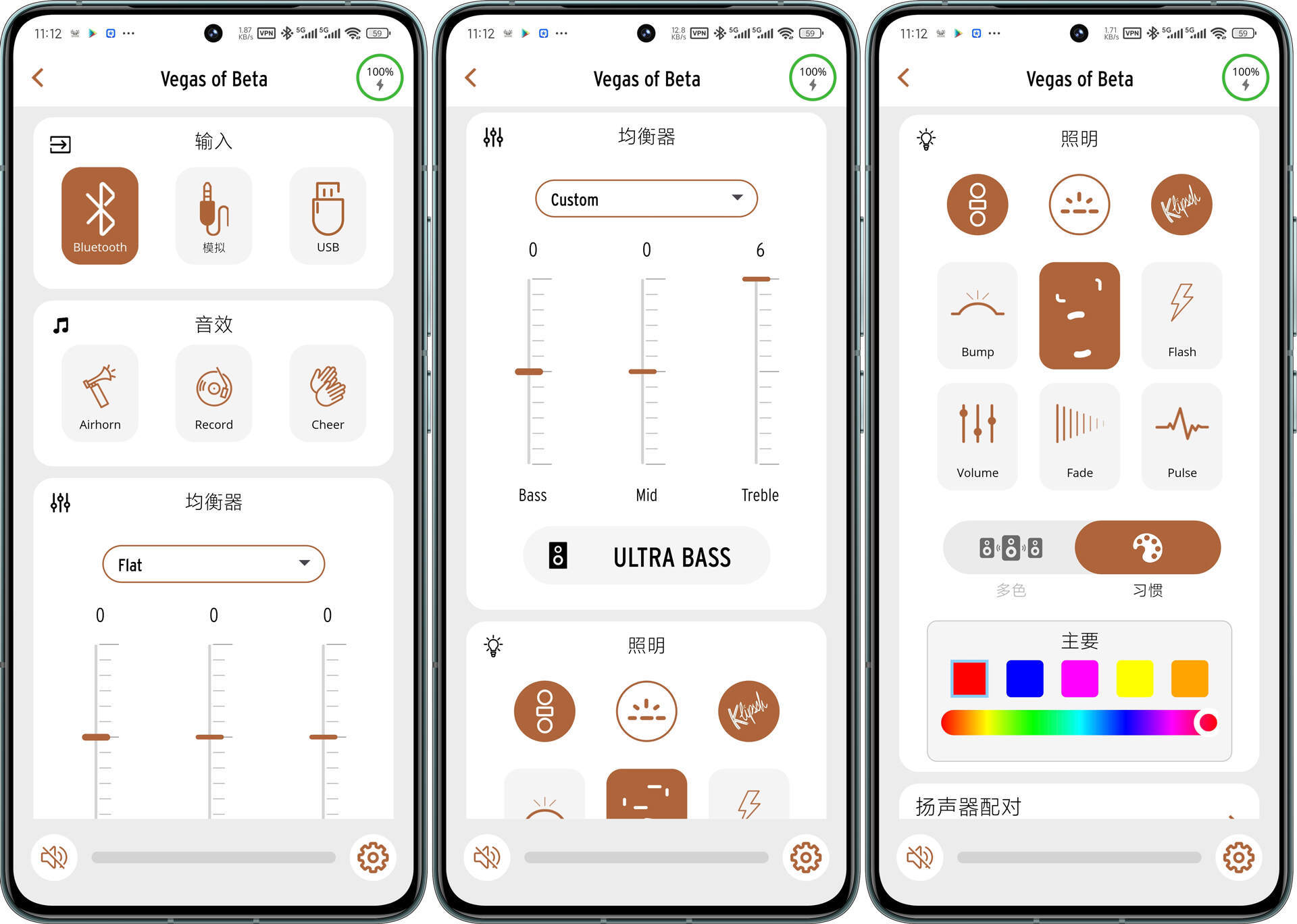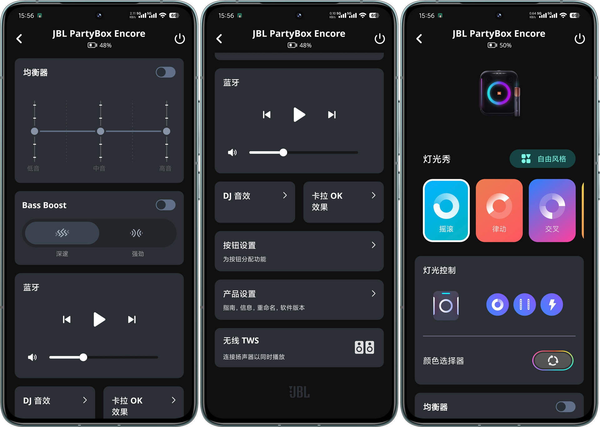 两款音响都配有专属手机app,核心功能大同小异——灯效调节、EQ调节、低音增强、音乐控制等等。