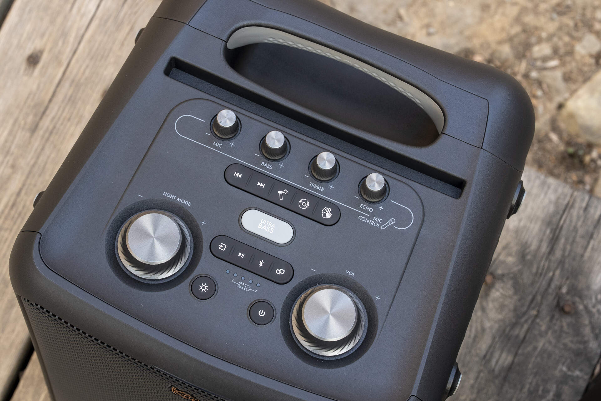 JBL PartyBox Encore走简约路线,布局紧凑,只保留基础功能按键,甚至把音量旋钮和播放键集成到了一起,上手简单直接。但是有些功能要到手机app里去调节,用起来稍显麻烦一点儿。