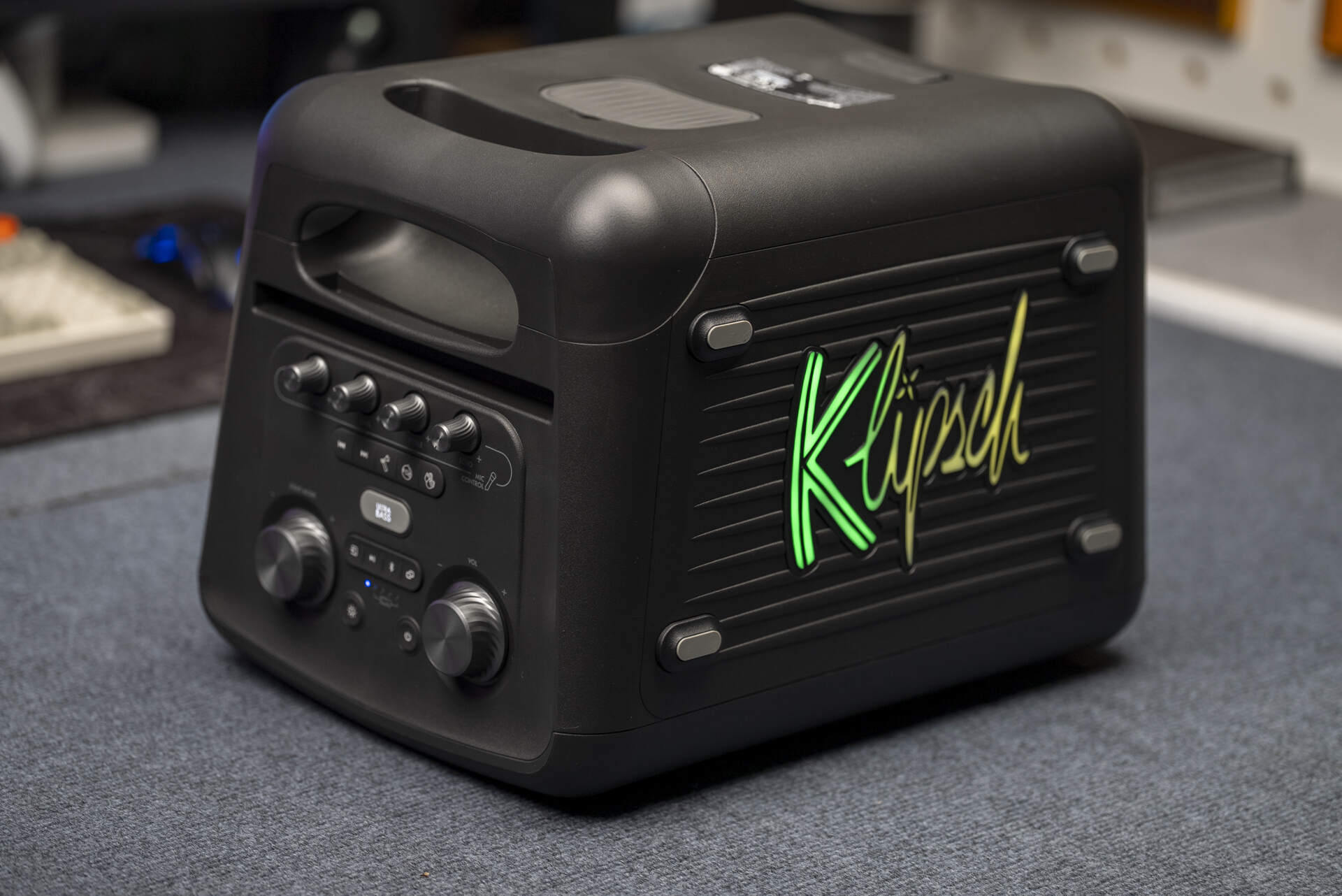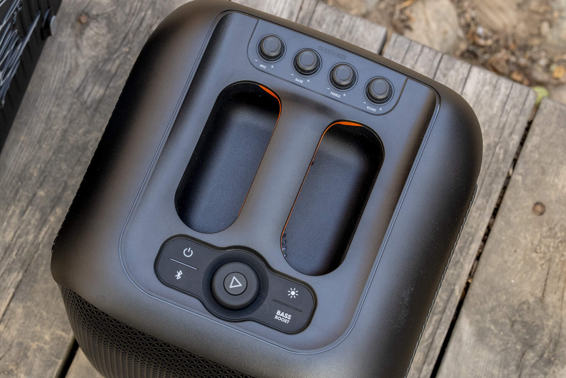 操作体验上,两款音响的控制区域都集中在顶部,但设计思路有一定的差别。杰士Vegas的面板布局更宽松,按键更独立,操作逻辑更清晰。除了右侧的音量旋钮,左侧还专门设计了灯效调节旋钮,银灰色的旋钮质感在线,旋转时阻尼感恰到好处,每一档调节都精准可控。