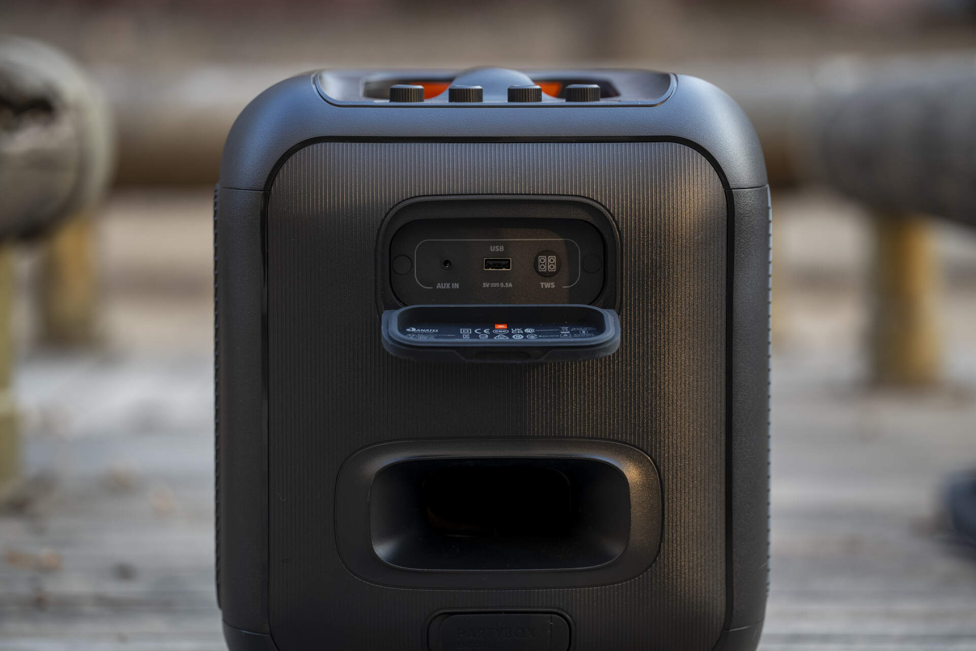 JBL PartyBox Encore的接口比较基础,只有3.5mm音频输入、USB接口和TWS互联键。