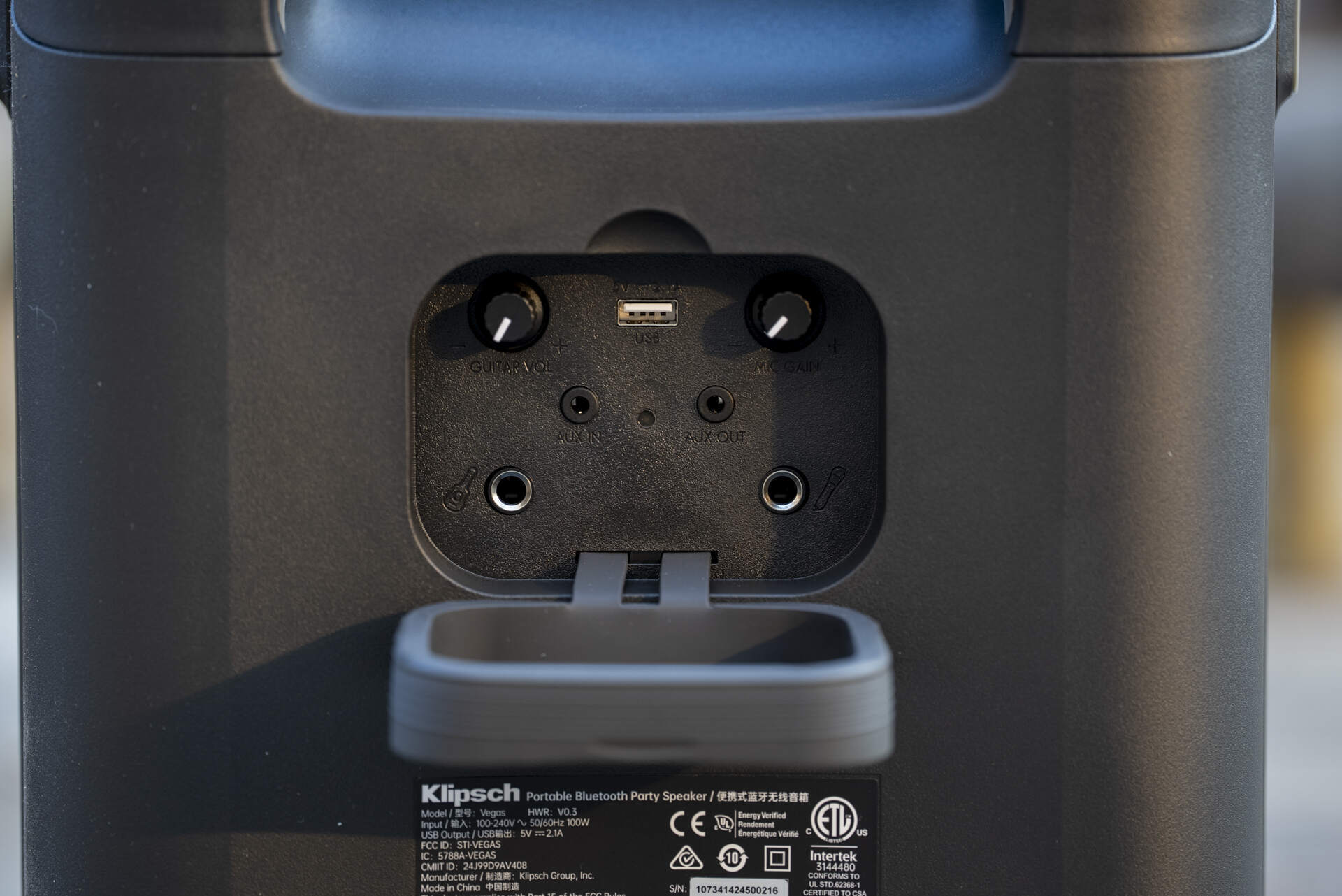 不过杰士Vegas也用细节设计弥补了体积偏大的短板。顶部靠后的提手位置很巧妙,拎起来时胳膊能自然贴近身体,省力不少;机身两侧的突出支撑脚更是实用,可以把音响躺平摆放是JBL PartyBox做不到的。