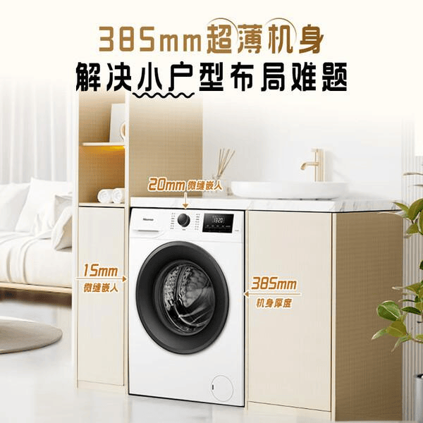 这款海信HG75NE1洗衣机采用超薄嵌入设计,机身厚度仅385mm,非常适合空间有限的家庭,能轻松融入各种橱柜中,看起来简洁又实用。搭载BLDC变频电机,运行平稳并且静音,能效等级达到一级,既节能又能保护衣物,在日常使用中表现得相当不错。