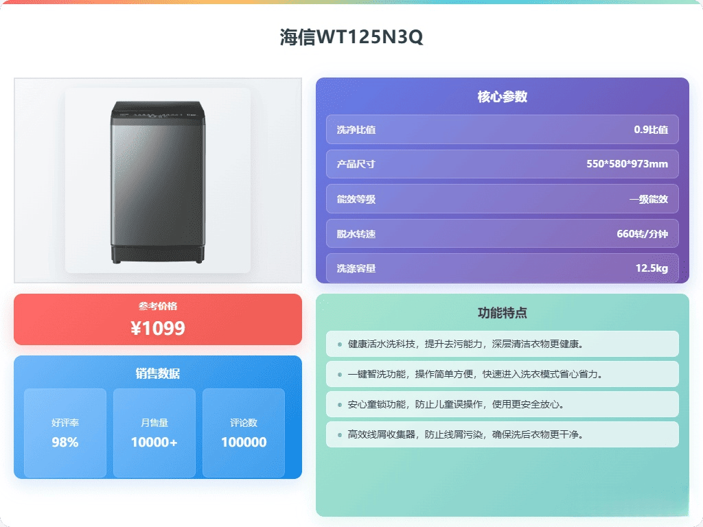 除了清洁能力,使用的便捷性也是选购洗衣机时的重要考虑因素。美的某些型号如MG100V930DE,强调智能化设计,具备一键智慧洗功能,能够自动识别衣物类型,极大地方便了用户。而海信的WT125N3Q则提供了12.5公斤的超大容量,适合大家庭,一次性洗涤更多衣物,省时省力。此外,海信在外观设计上也颇具匠心,WD20R4的复古圆角设计,颜值控一定会喜欢。