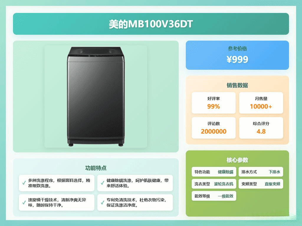 这款美的MB100V36DT洗衣机采用直驱变频电机,运行平稳,噪音控制出色。它配备多维减震结构,即使地面不平也能保持静稳,提升使用体验。丰富的洗涤程序,包括除菌、除螨和抗菌洗,能深层清洁衣物,特别适合对卫生要求较高的家庭。