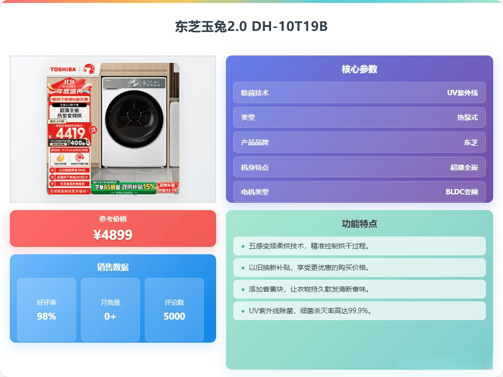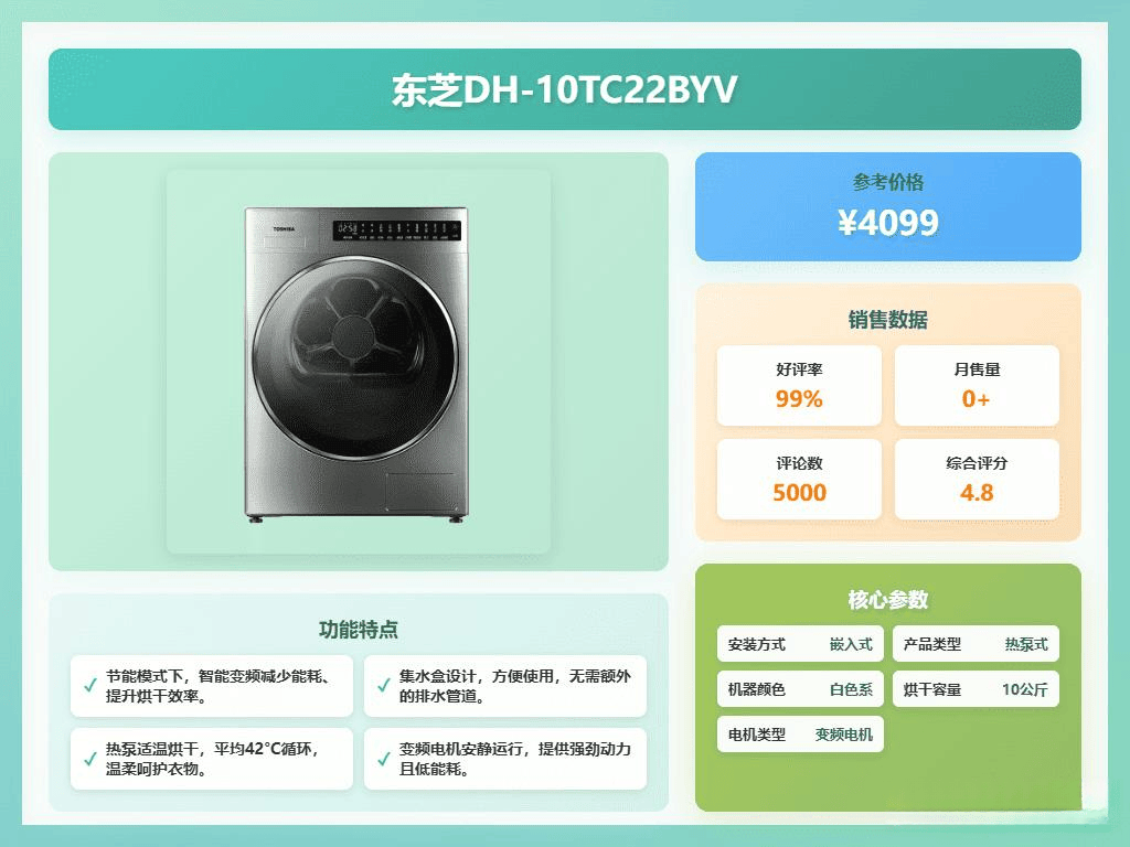 除了容量和技术,静音效果和节能性也得考虑。毕竟,谁也不想大半夜被烘干机的噪音吵醒。东芝的一些型号采用了变频电机,运行起来比较安静,而且还省电。如果家里有对卫生要求比较高的,可以选择带紫外线除菌功能的型号,比如“东芝玉兔2.0 DH-10T19B”,烘完的衣物更安心。总之,根据自己的需求和预算,认真挑选,总能找到适合你的那一款东芝烘干机。