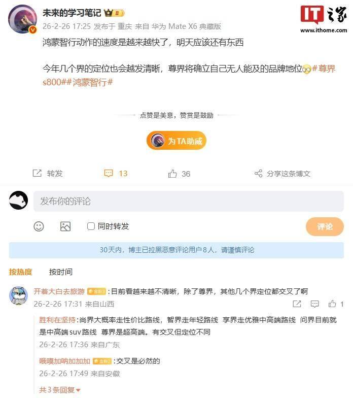 IT之家 2 月 26 日消息,博主 @未来的学习笔记 今日发文透露,鸿蒙智行动作的速度越来越快,明天应该还有东西。