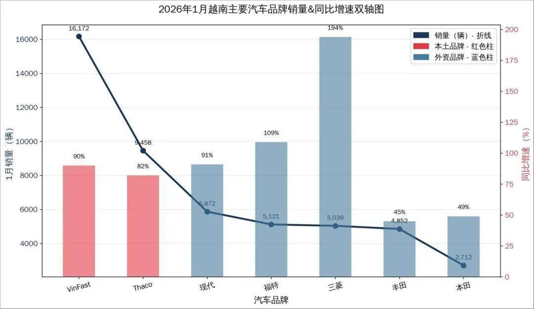 越南汽车制造商协会(VAMA)放出一组令人咋舌的数据:2026年1月,越南新车销量达到29774辆,同比暴涨90%。在全球主要汽车市场普遍进入微增长甚至负增长的当下,这个数字足以让任何车企高管心跳加速。