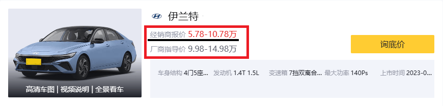首先从价格聊起,定位为紧凑型轿车的北京现代伊兰特的厂商指导价为9.98-14.98万元,提供了1.5L自然吸气发动机+CVT无级变速、1.4T涡轮增压发动机+七速双离合变速箱,两种动力组合。根据在我们当地了解到的信息来看,现代伊兰特全系车型拥有3万左右的优惠,入门版车型优惠之后裸车价格6.88万元,这价对于一款合资紧凑型轿车来讲还是挺实惠的。
