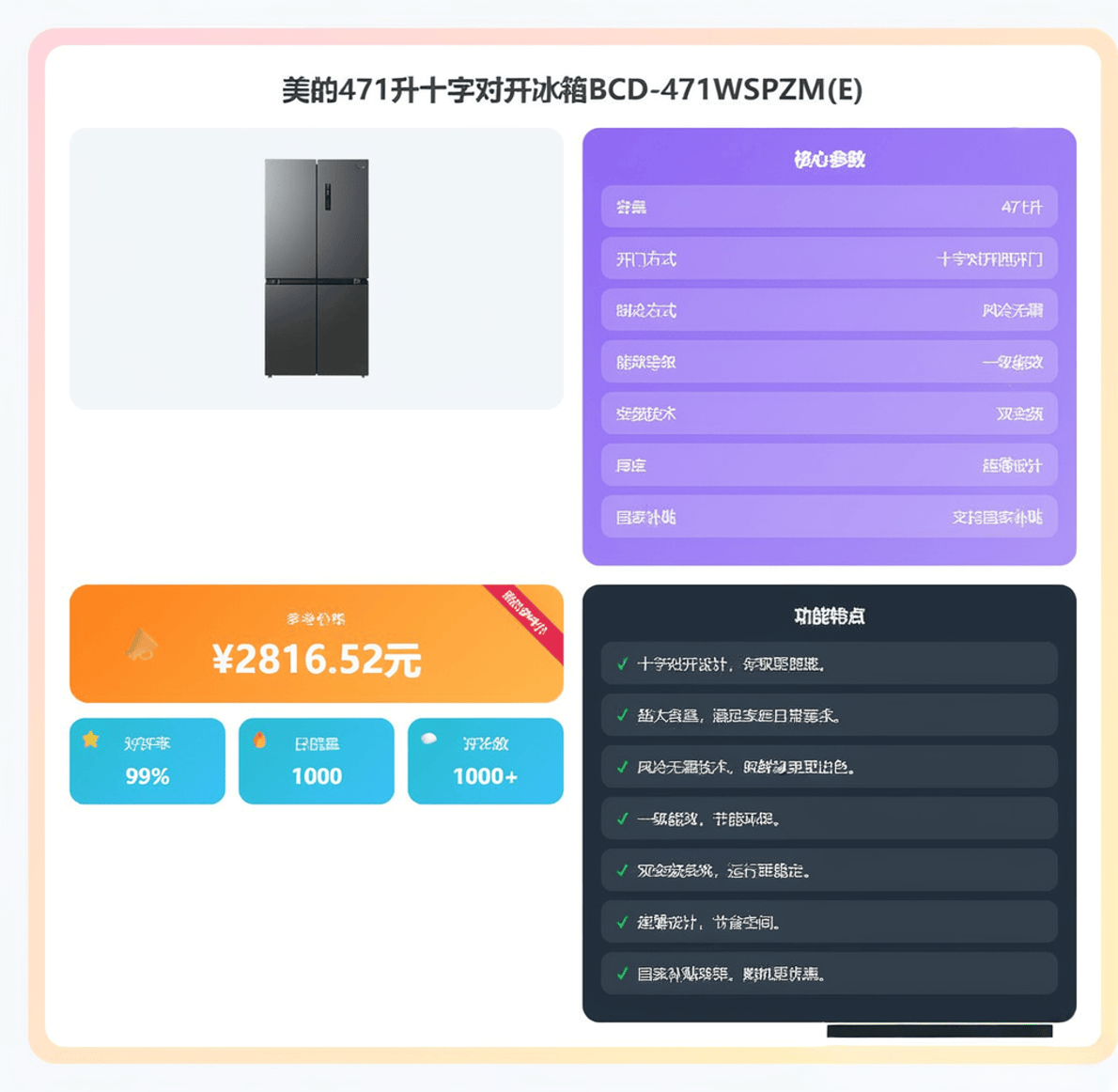 作为美的的中端款,471升十字对开冰箱BCD-471WSPZM(E)以2809元的价格,展现了其出色的性价比。它的设计分区非常细致,冷藏、冷冻和变温区域一应俱全,满足了不同食材的存储需求。