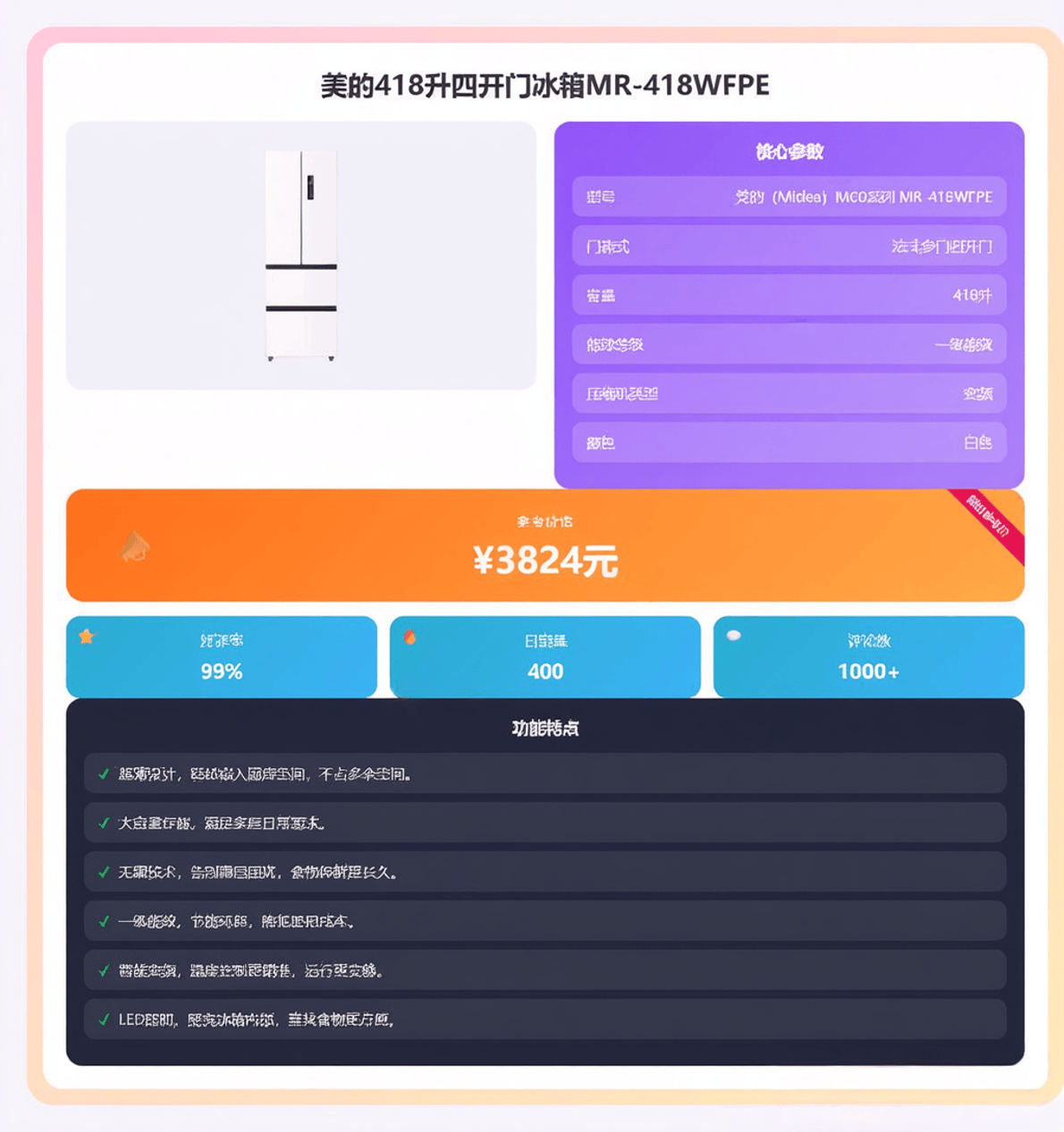 最后一款是美的418升四开门冰箱MR-418WFPE,售价3658元。这款冰箱采用法式多门设计,冷冻室为大抽屉,方便取放大件食材,非常人性化。