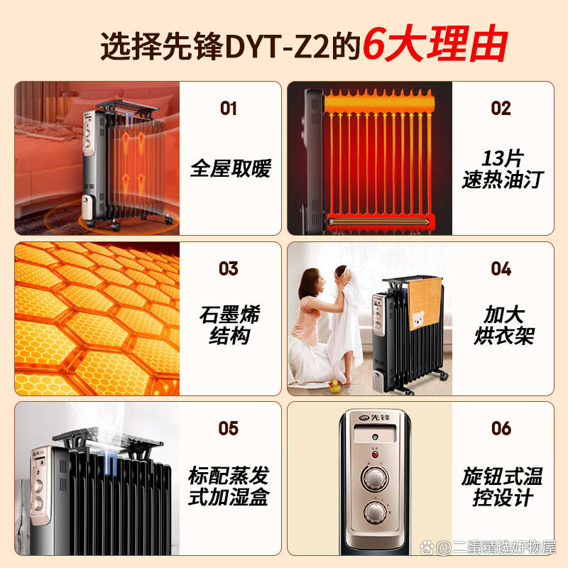 如果你怀念暖气片那种由内而外的温暖,但又担心普通油汀升温太慢,先锋的石墨烯油汀可以打消你的顾虑。它在保留传统油汀储热好、断电后仍能长时间散热的优点基础上,加入了石墨烯发热体,提升了初始升温速度。13片宽大叶片保证了散热面积和温度均匀性,配备烘衣架和加湿盒,适合有宝宝或老人的家庭,整夜开启也不会感到干燥。