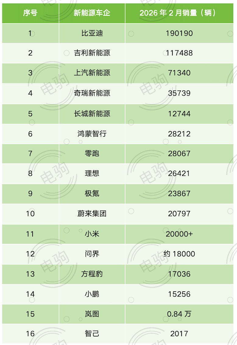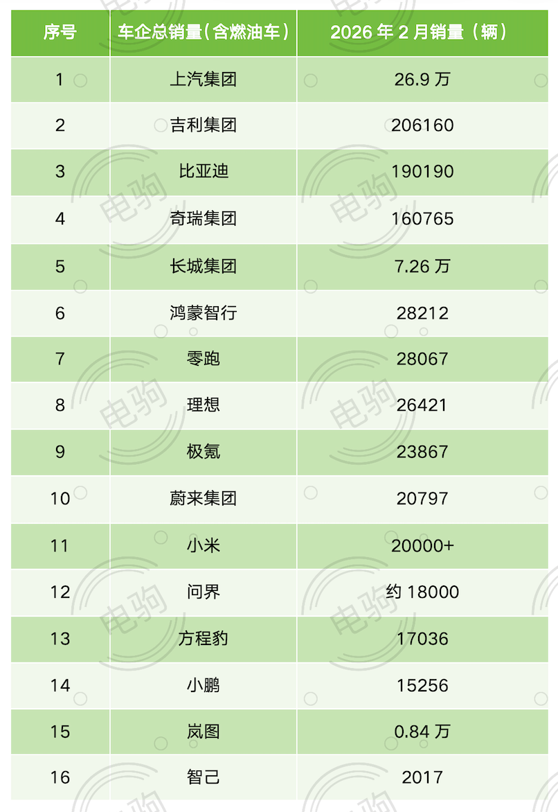 2026年2月车企新能源+总榜销量来了,下面我们就来看看。