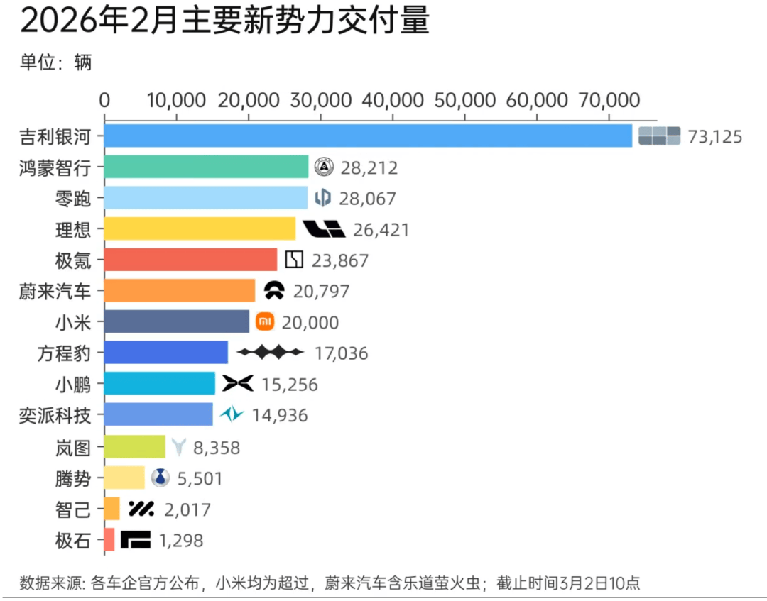 由此把视线聚焦在另一位车圈流量担当小米身上,2月交付新车仅超2万辆,乍一看确实有些大跌眼镜。但静下来一想,在新款SU7尚未补位,YU7储备订单逐渐被消耗的基础上,又显得情有可原。