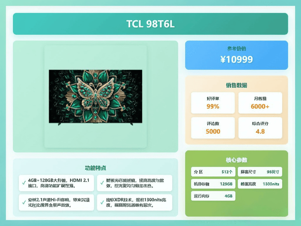 配置和芯片也很重要,毕竟电视也是电子产品,配置高一点,用几年也不会卡。现在很多TCL电视都带智能语音助手,动动嘴就能控制电视,特别方便。如果预算充足,可以考虑98Q9M、98Q10L这些高端型号,画质和音效肯定更好。如果预算有限,98T6L、98T7L Pro也不错,性价比较高。另外,像雷鸟鹤6这种主打性价比的型号也可以关注,不过在用料和画质上可能会稍逊一筹。