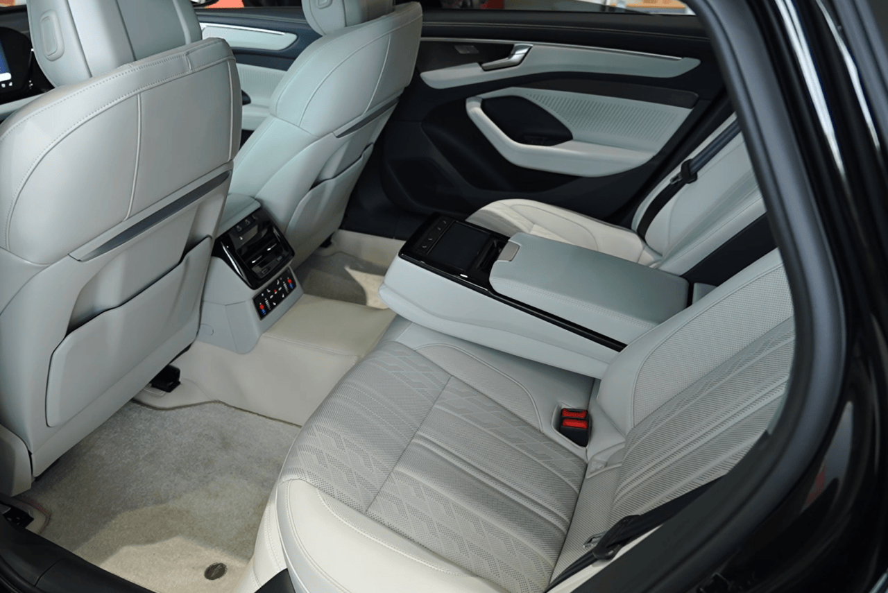 此外,因为全系Quattro的缘故,第二排中间高高隆起的传动轴依然还在,这样让A6L的中间位置坐起来那是相当将就——但行政级轿车满载5人的场景并不常见,隆起的地台反而让左右两个座位的独立感更强,翻下中央扶手之后,后排的行政豪华氛围拉满。这一点宝马奔驰竞品也都是差不多的。