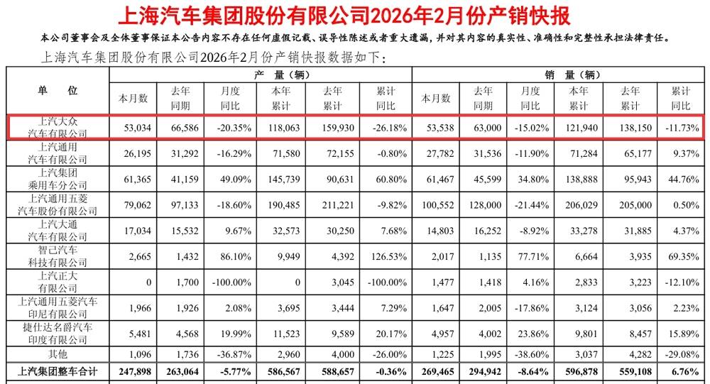 作为上汽集团销量担当之一的上汽大众,2月销量53538台,同比下滑15.02%,环比下滑21%。2026年1-2月累计销量为121940台,同比下滑11.73%。尽管市场表现还算可以,但这已经是上汽大众连续多个月出现销量下滑了。