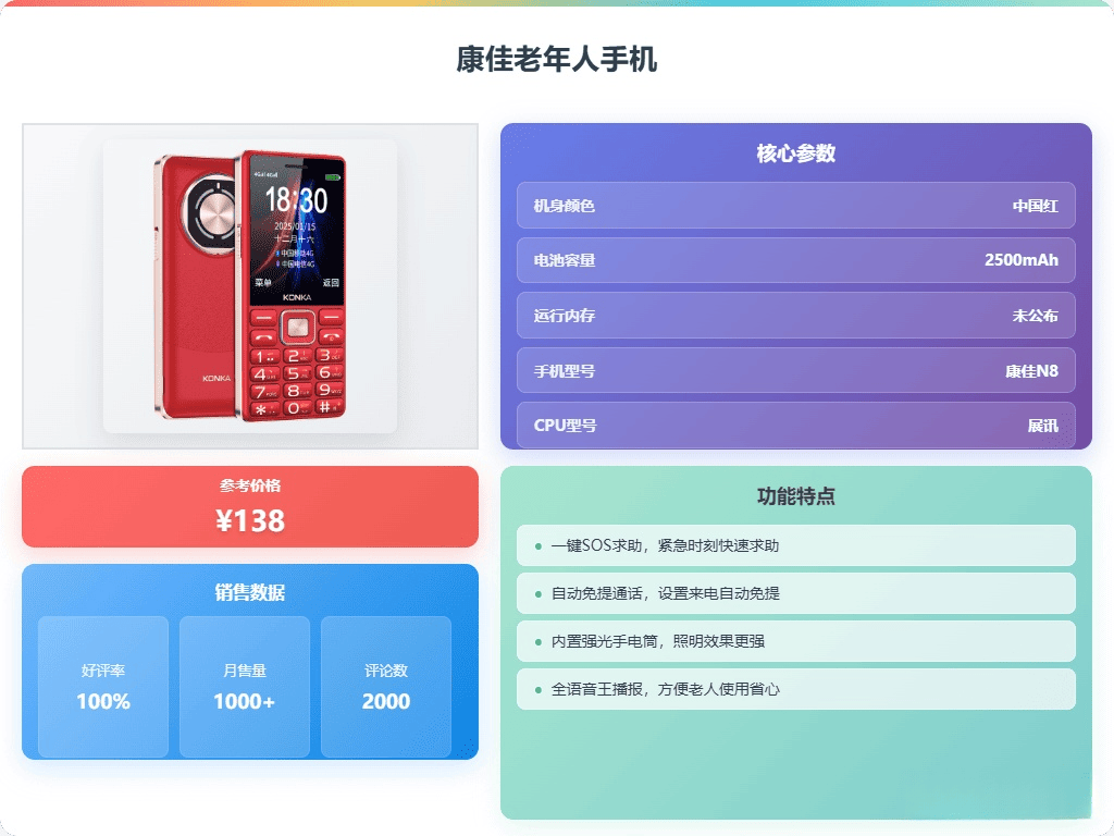 超长待机:这款手机配备了2500mAh的大电池,基本上可以让用户一周内无需担心充电问题。充电速度也很快,3个小时就能充满,老人家再也不用天天盯着充电器了。