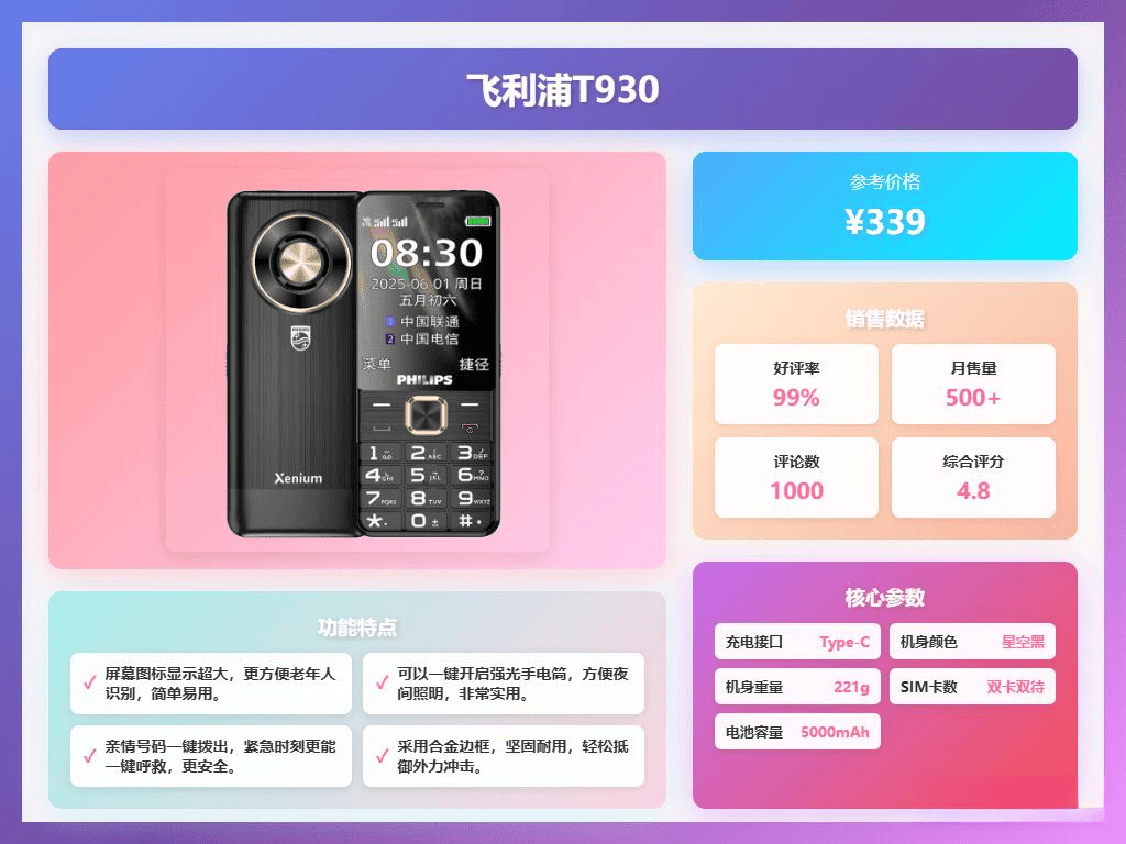 超长待机:飞利浦T930手机的待机能力令人惊叹,最高可达到120天,基本上不需要频繁充电,出门在外也能让人更加安心。
