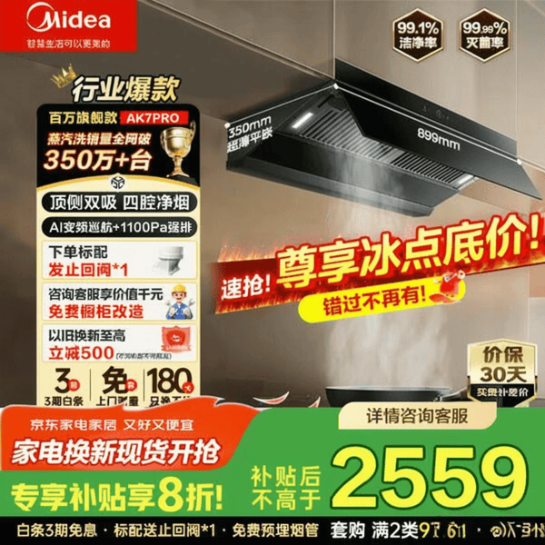 美的AK7PRO油烟机配备了28立方米/分钟的大吸力,即使在大火爆炒时也能迅速将油烟排出,保持厨房空气清新。其顶侧双吸设计结合了顶吸和侧吸技术,能够全面覆盖油烟升腾区域,让油烟不再四散飘散。