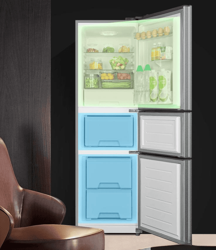 多温区存储:这款冰箱设计了三个独立温区,可以冷藏、冷冻、保鲜区分开存放,避免不同食材串味,储存更灵活、更卫生。